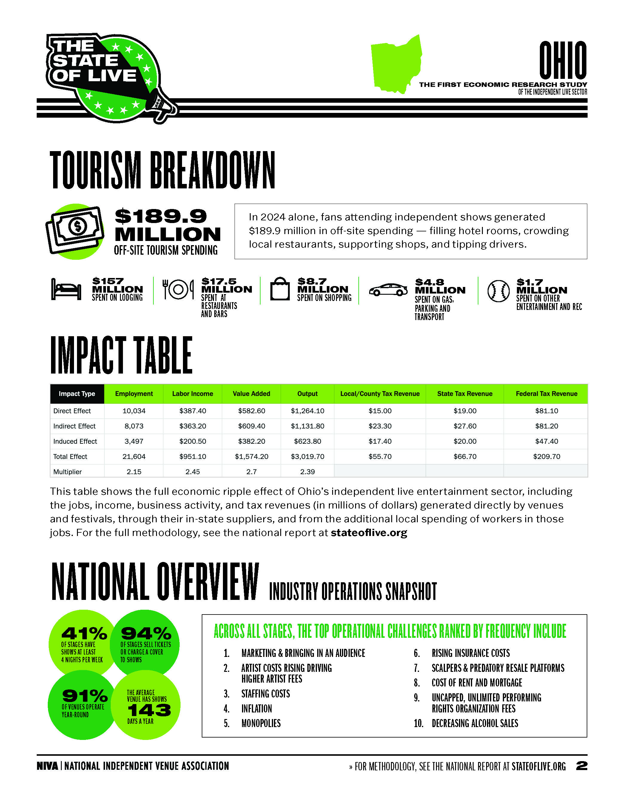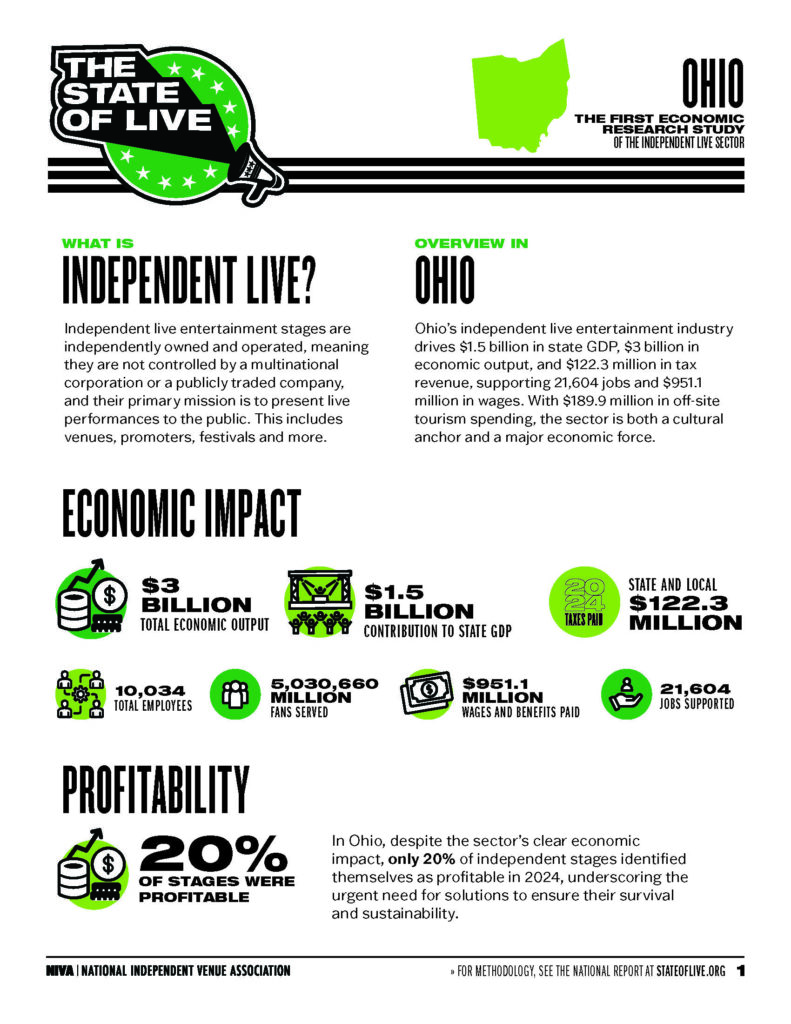 “Independent venues and festivals are more than cultural assets. They are major economic drivers,” said Stephen Parker, Executive Director of NIVA. “In Ohio, the independent live sector generates $3 billion in economic output and supports 21,604 jobs. That scale rivals some of the largest investment and job announcements in the state, and it should be top of mind for governors, legislators, and local officials when making decisions about investing in the arts and live entertainment. Independent stages are proven community anchors and should have a seat at the table when leaders set priorities for economic growth and cultural investment.”